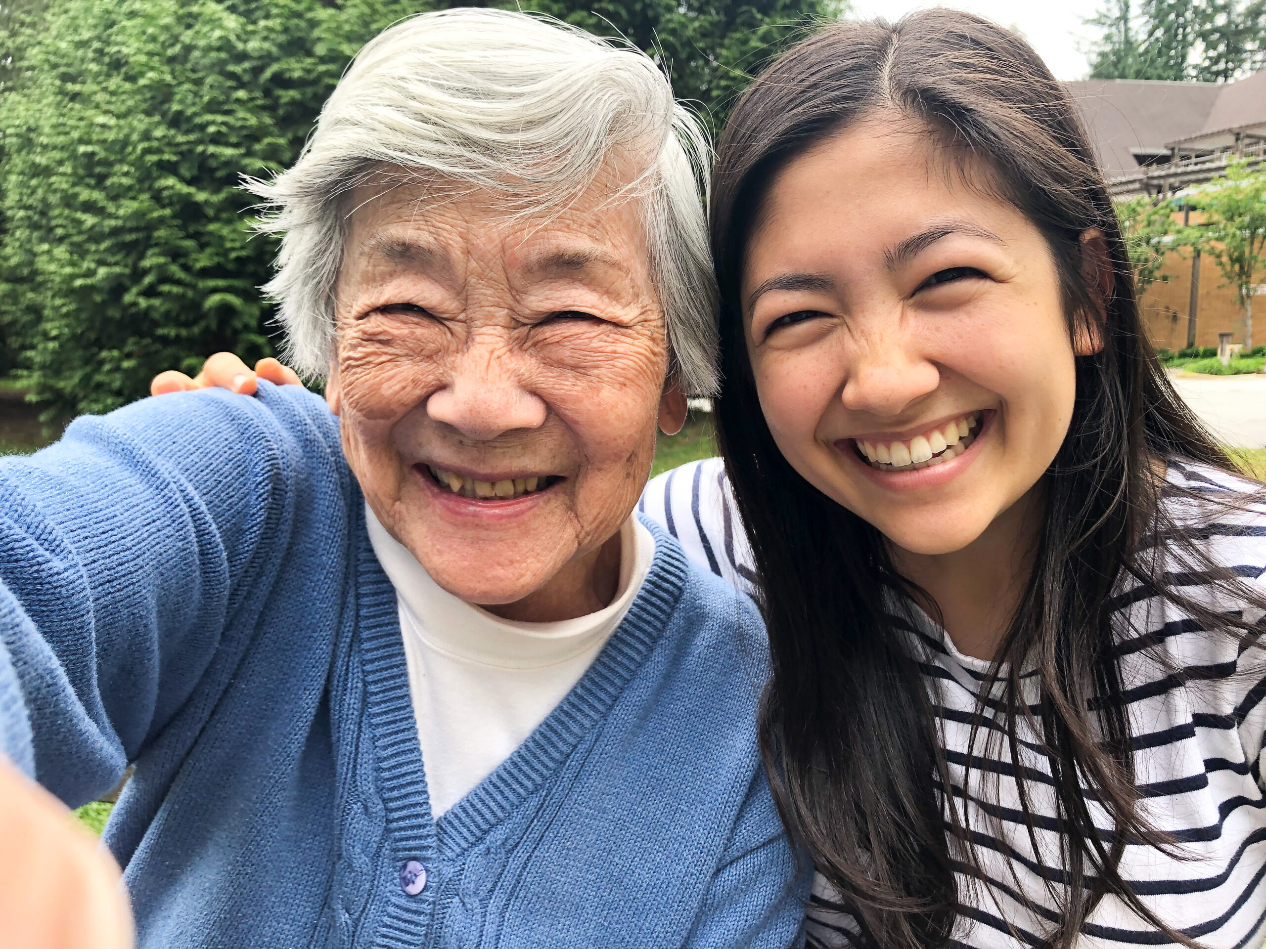 Grandmother in 90s Taking Selfie with Granddaughter Outside Retirement Home